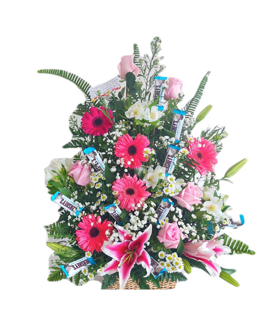/ Arreglo de 12 flores rosadas variadas con chocolates y globo de nacimiento