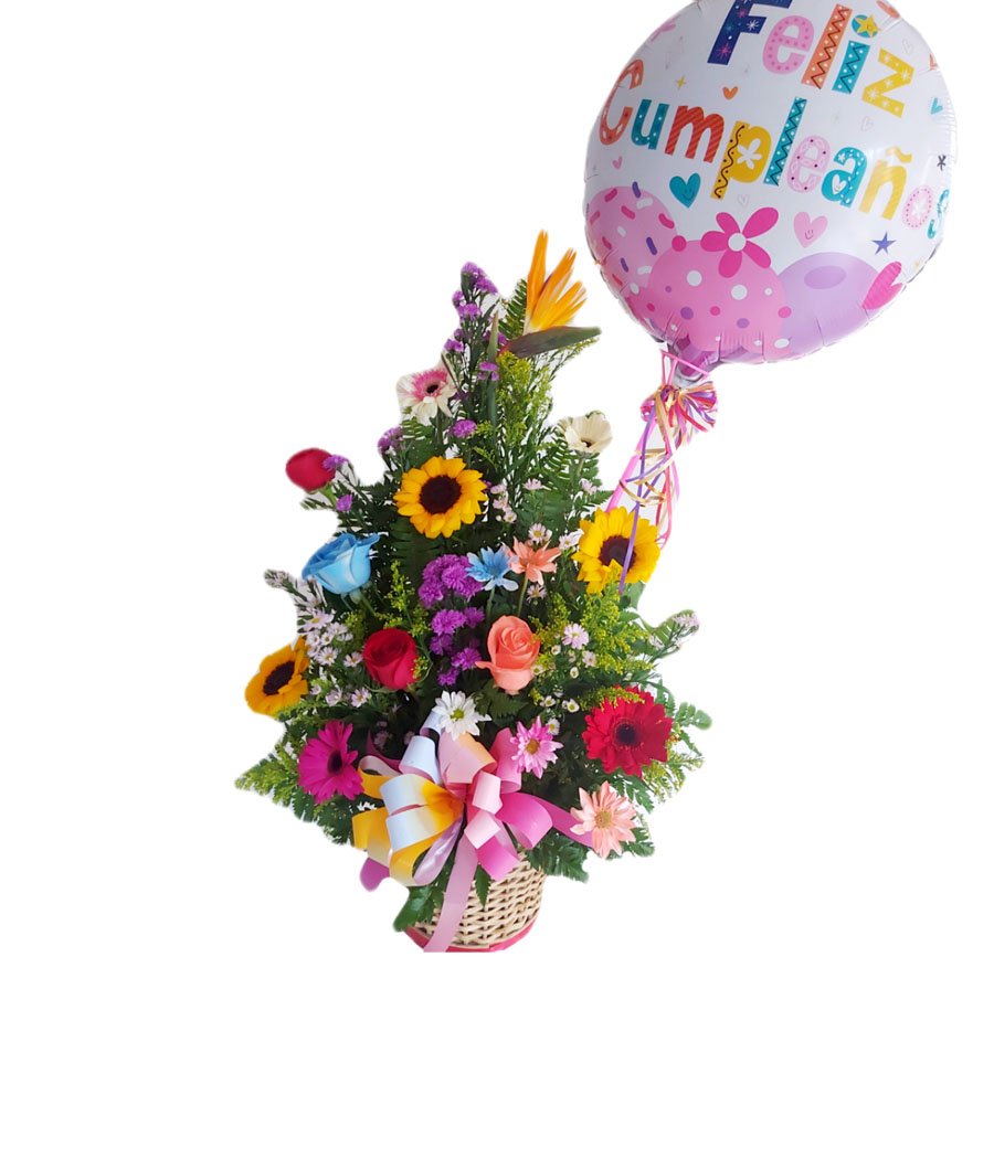 Arreglo de 1 ave, 3 girasoles. 4 gerberas y 4 rosas variadas con globo de cumpleaños en canasta