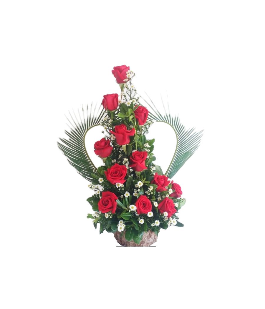 Arreglo de 12 rosas rojas con hojas finas en base de cáscara