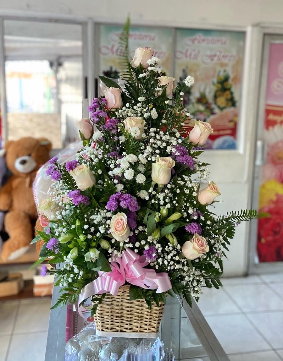 Arreglo de 12 rosas rosadas en canasta