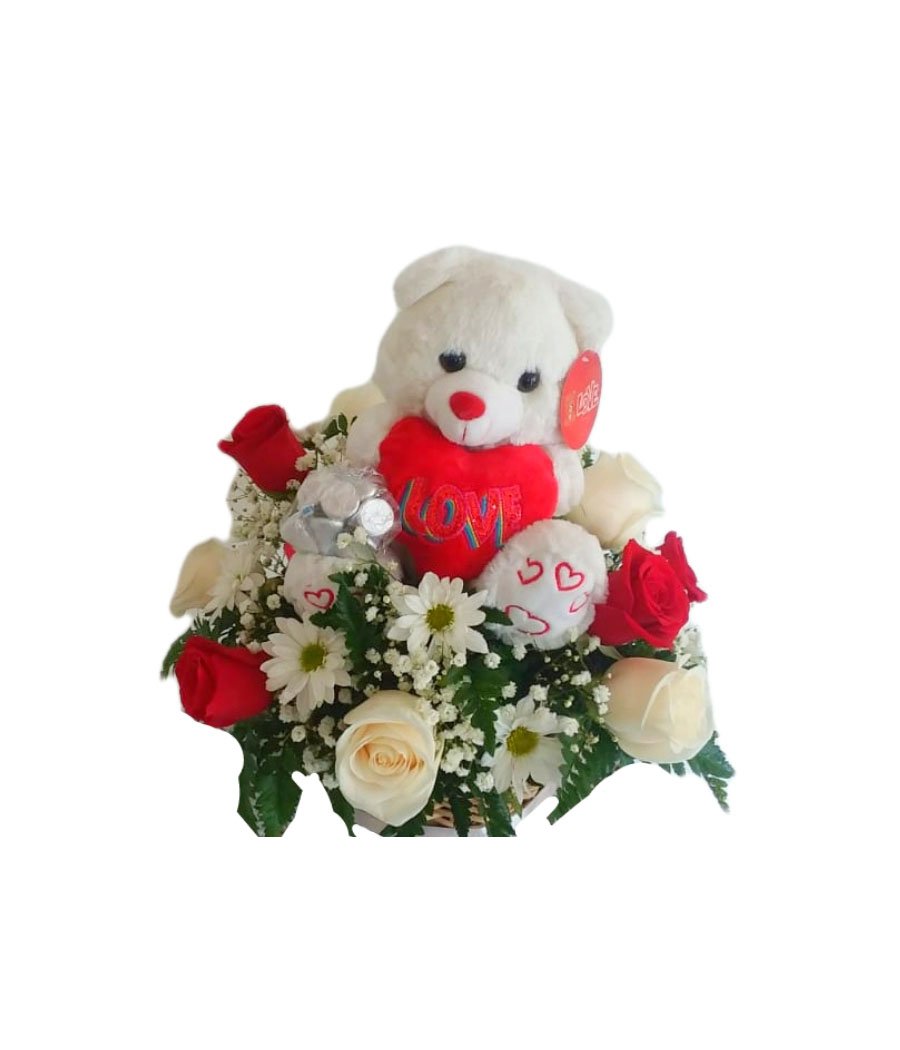 Arreglo de 6 rosas rojas, 6 rosas blancas, peluche mediano y paquete de 10 kisses
