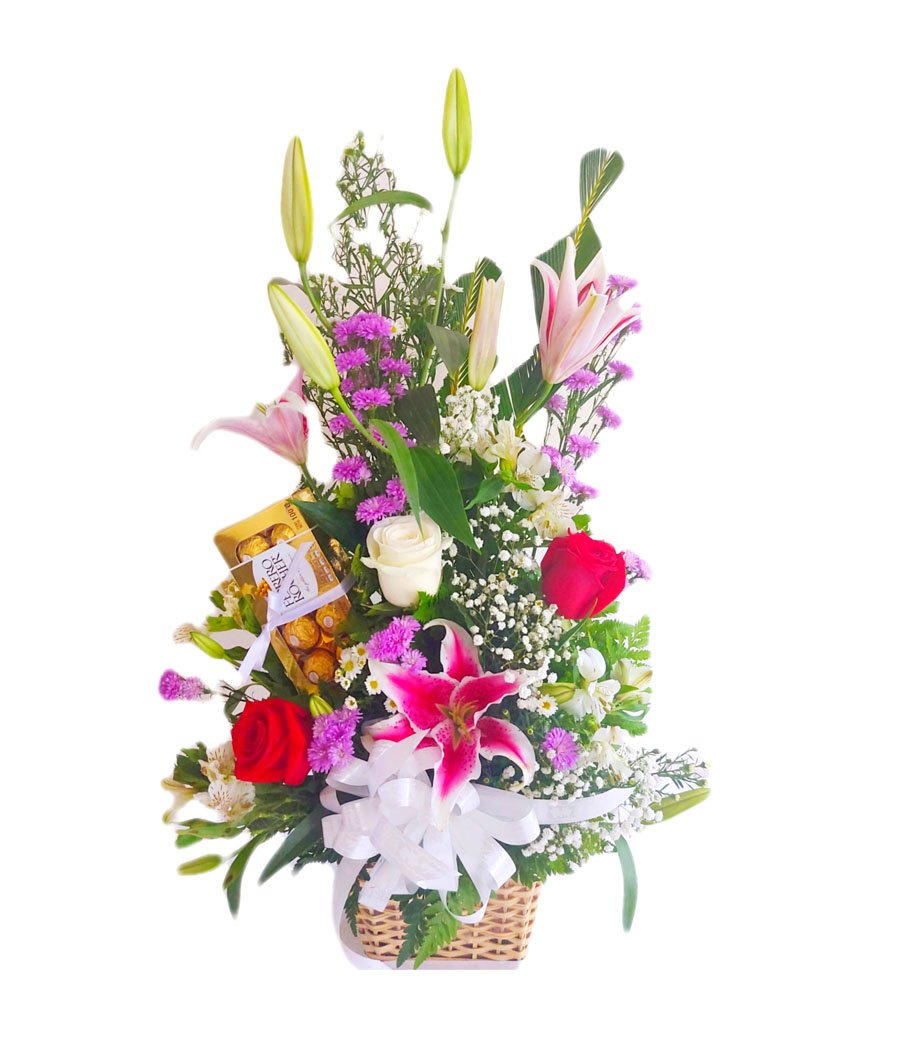 Arreglo de 12 lirios rosados, 3 rosas rojas y 3 rosas blancas con caja de 8 chocolates Ferrero en canasta