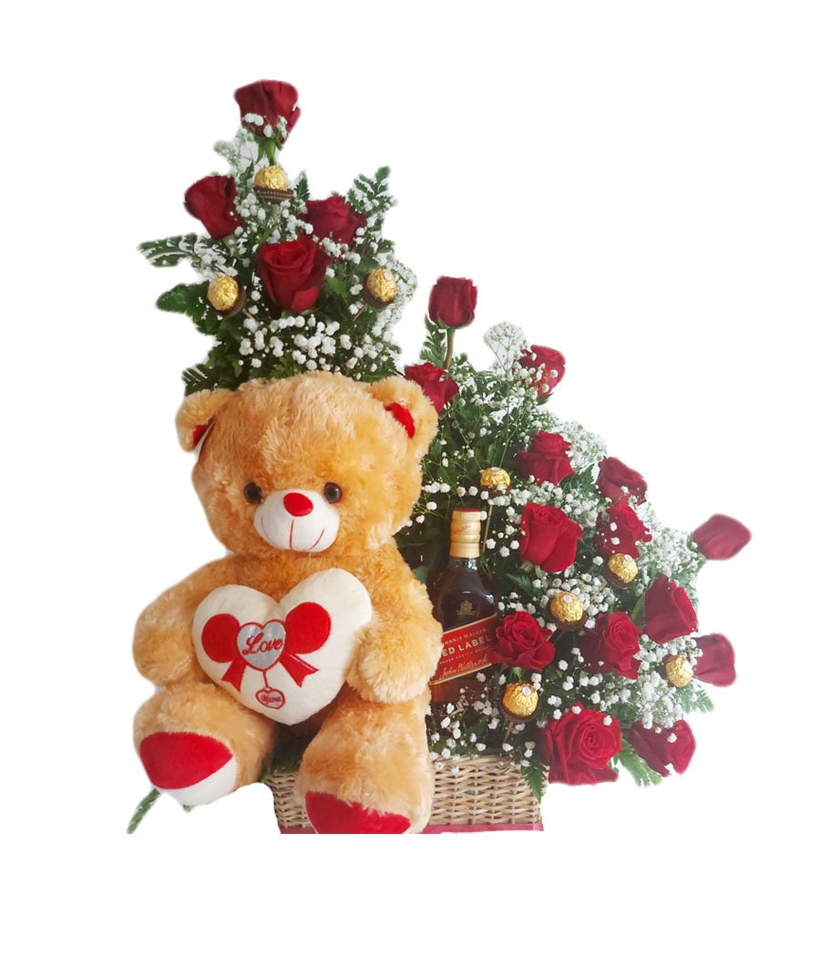 Arreglo de 18 rosas rojas con peluche grande, botella de Red Label y 8 chocolates Ferrero