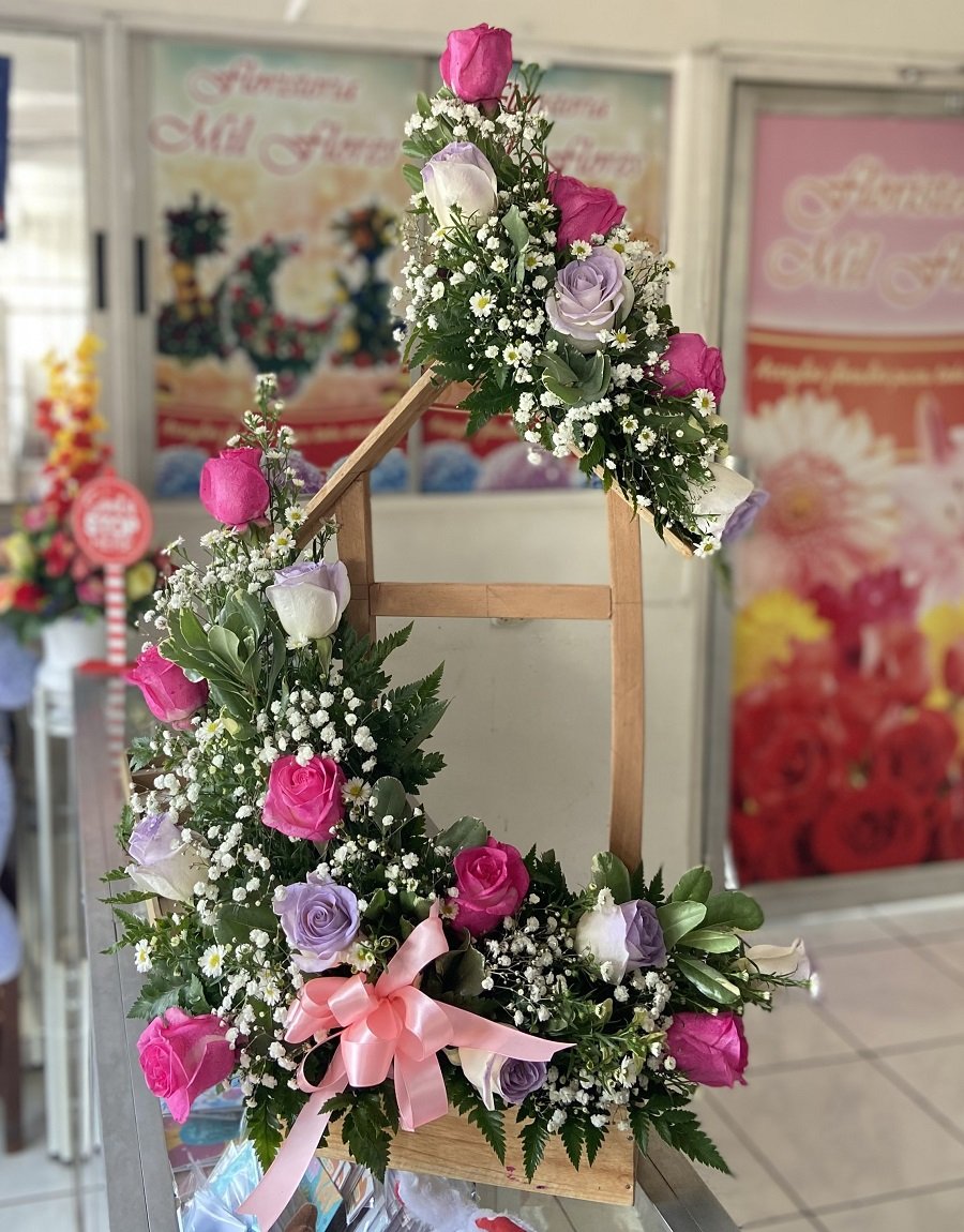Arreglo de 9 rosas teñidas en fucsia y 9 rosas teñidas en lila con base de casa de madera