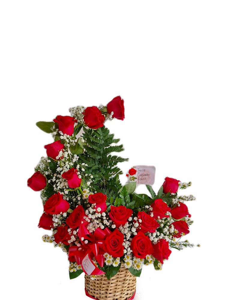 Arreglo de 24 rosas rojas con forma de media luna en canasta