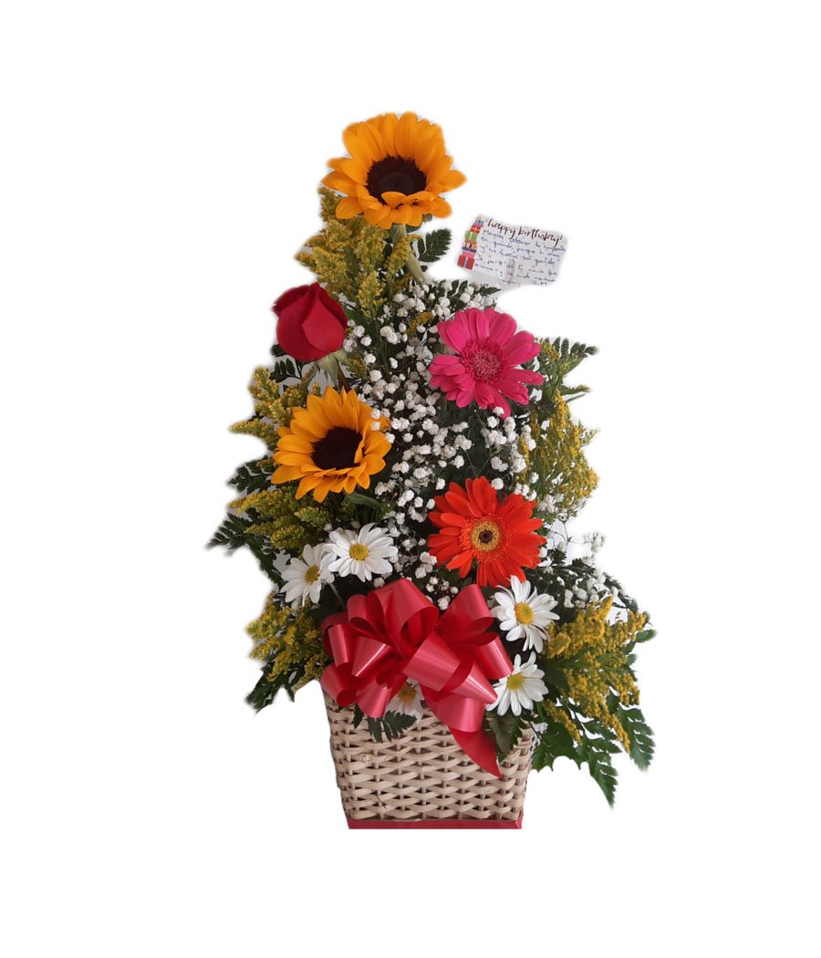 Arreglo de 2 gerberas, 2 girasoles y 2 rosas variadas en canasta