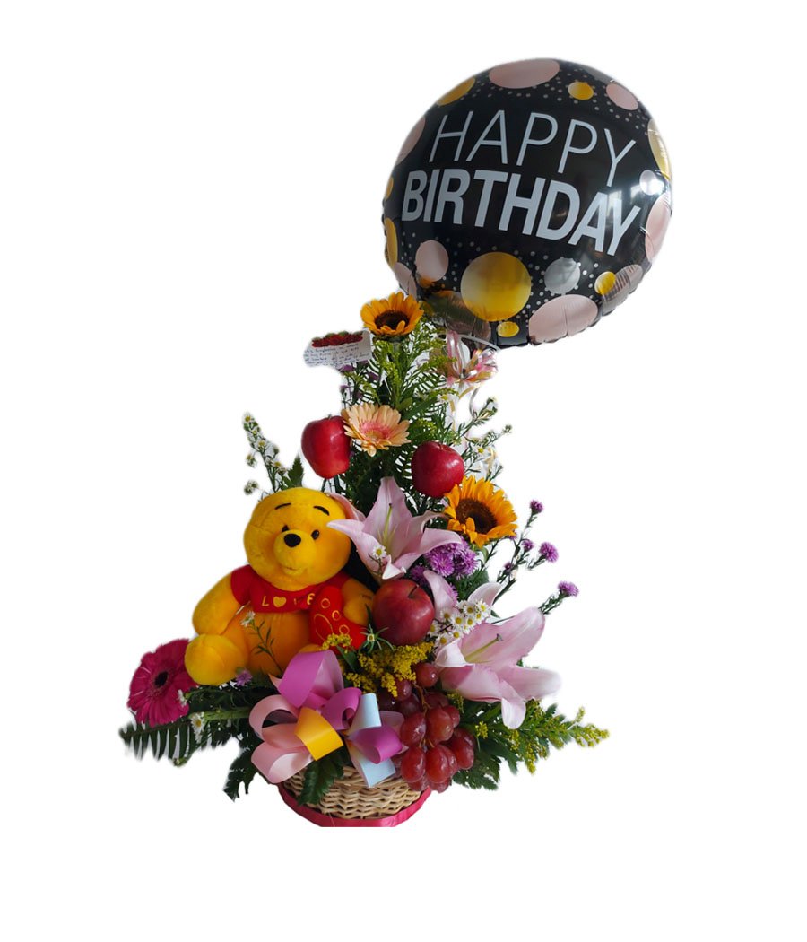 Arreglo de 2 girasoles, 2 gerberas y 2 lirios rosados con 6 manzanas, uvas y globo de cumpleaños en canasta