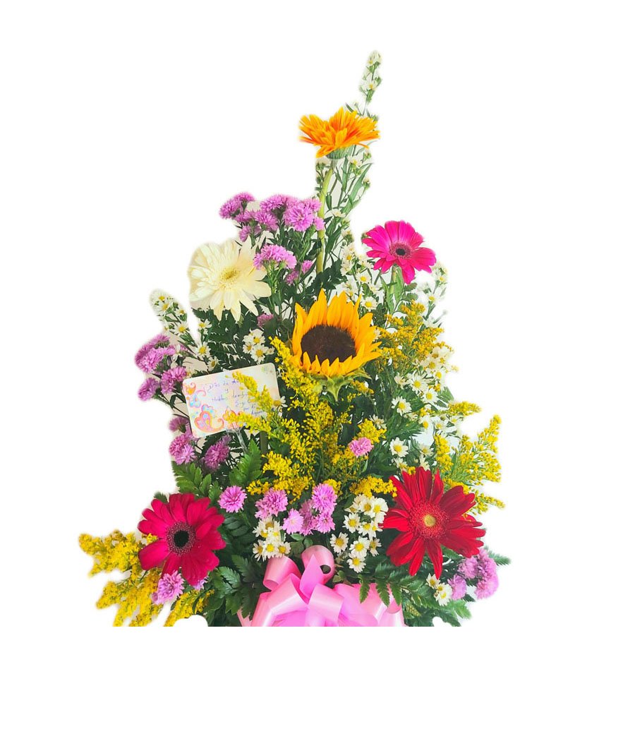 Arreglo de 5 gerberas y 1 girasol en canasta