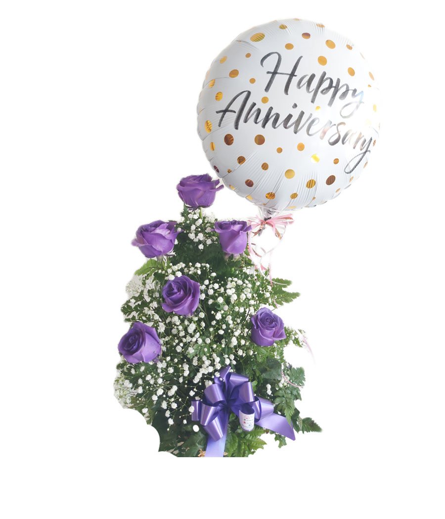 Arreglo de 6 rosas teñidas en morado con globo de aniversario