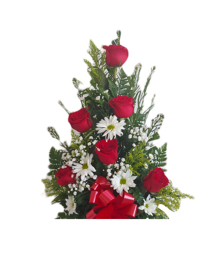 Arreglo de 6 rosas rojas con margaritas blancas en canasta