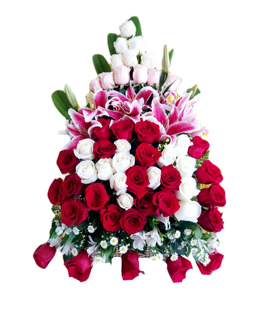 Arreglo de 20 rosas rojas, 20 rosas rosadas, 14 rosas blancas y 6 lirios rosados en canasta (Se puede formar un numero con las rosas blancas o dispersas)