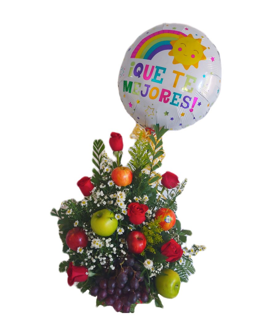 Arreglo de 6 rosas con 6 manzanas, uvas y globo de que te mejores.