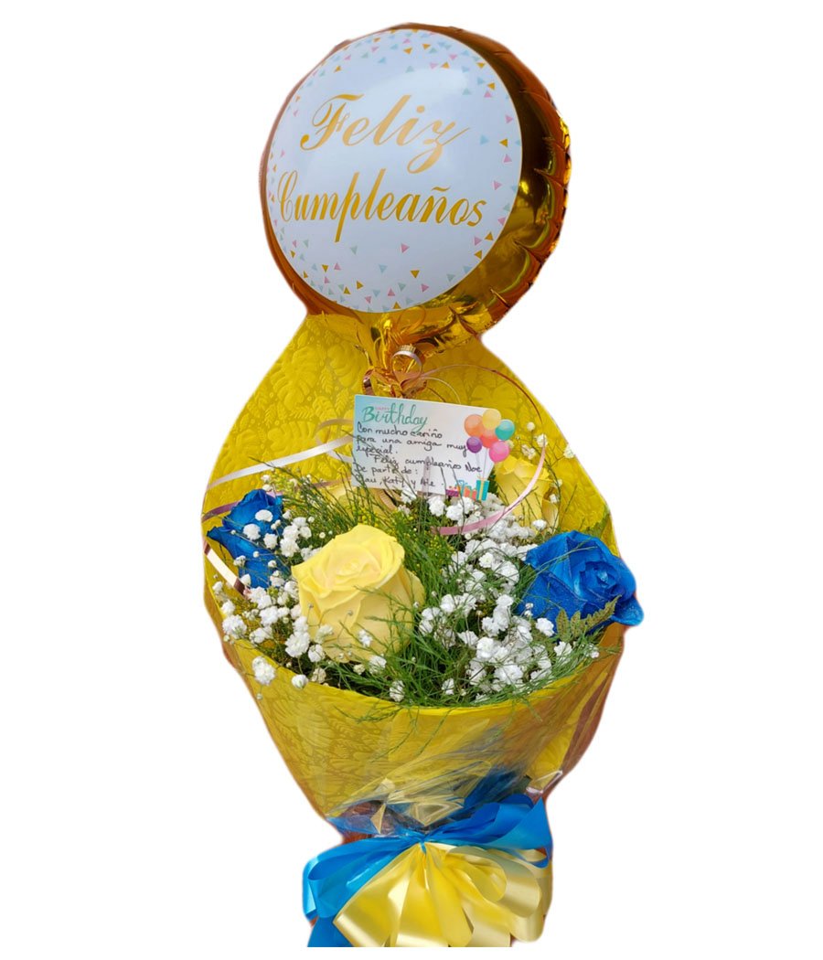 Bouquet de 3 rosas amarillas y 3 azules con globo