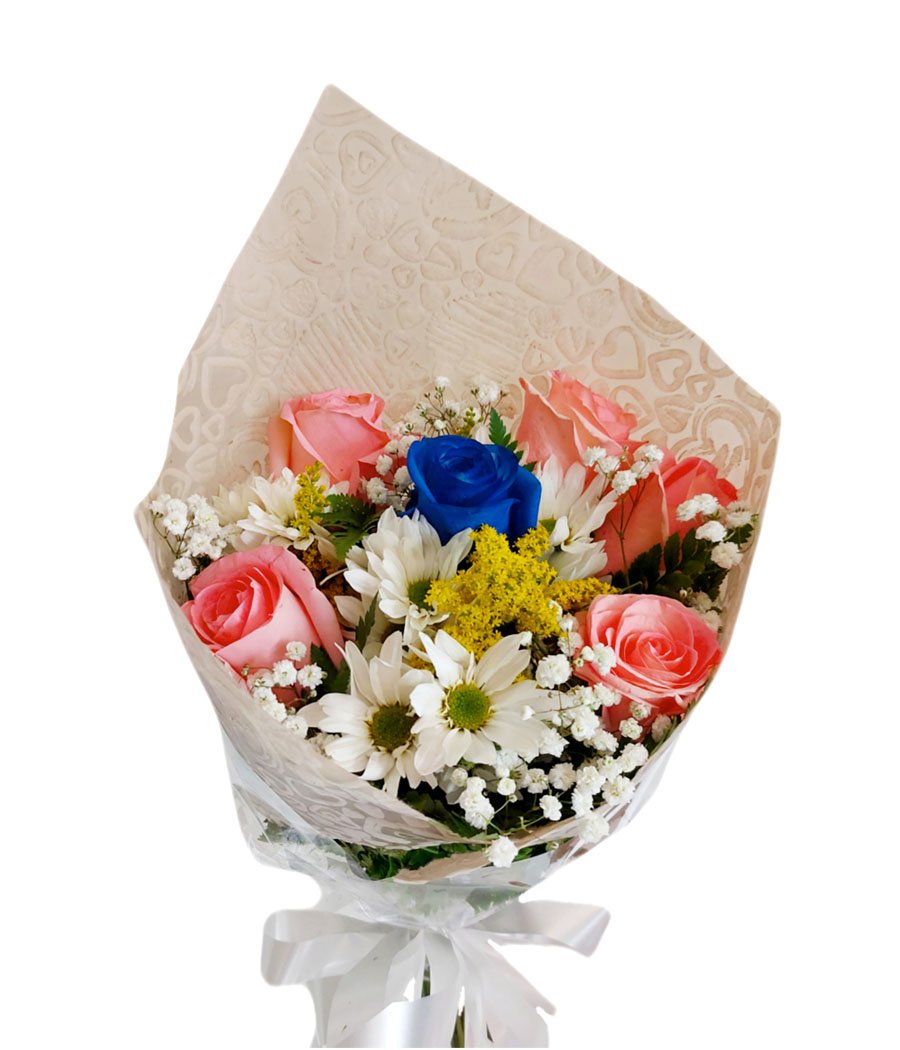 Bouquet de 5 rosas rosadas, 1 rosa azul y un globo de nacimiento.