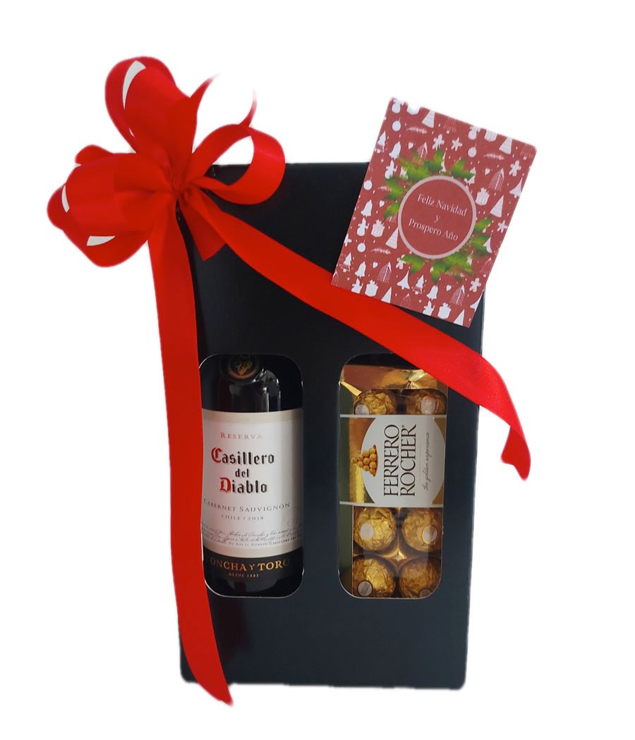 Botella de vino con caja de 8 chocolates Ferrero en caja negra especial.