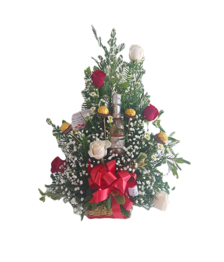 Arreglo de 3 rosas rojas, 3 rosas blancas, botella 200 ml Freixenet y 8 chocolates Ferrero en canasta