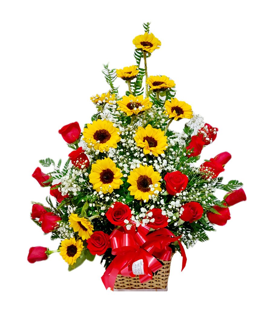 Arreglo de 12 rosas rojas y 12 girasoles en canasta