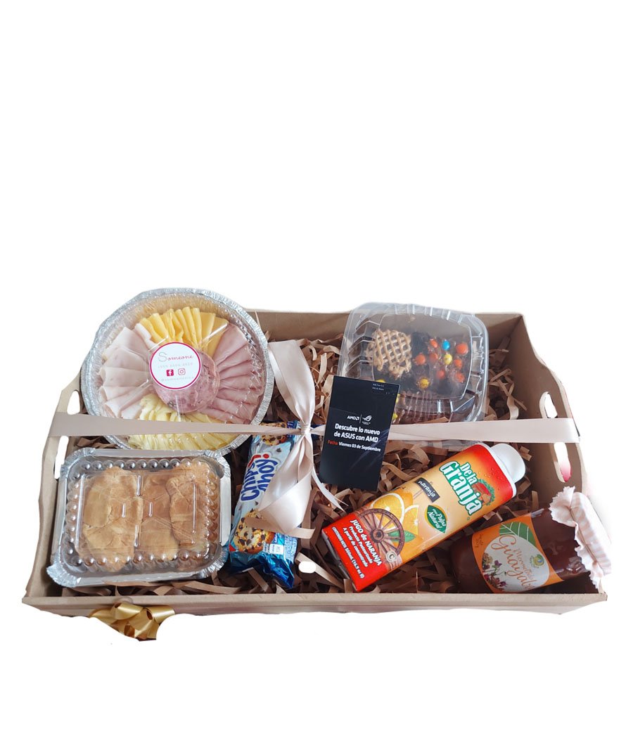 Bandeja grande con una mini bandeja de jamones, caja de croissants, galletas con chispas de chocolate Chips Ahoy, jugo de naranja, mermelada y brownies.
